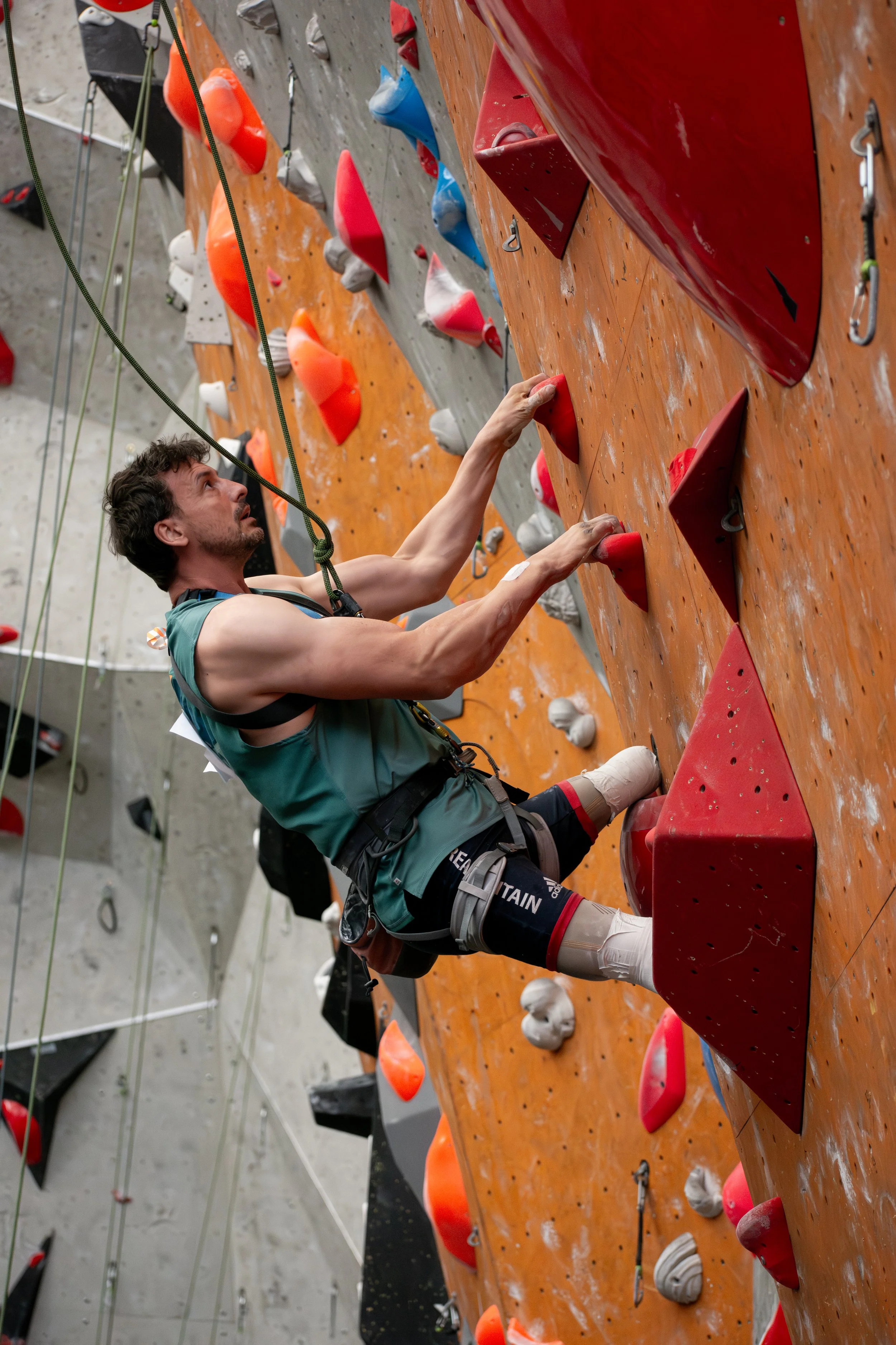 The day began at 10 a.m. with the first rounds of men’s and women’s qualifiers. It was the towering central wall at Ratho - one of the largest climbing arenas in Europe - that hosted all the action for the morning, with four climbing routes active at once in the qualifiers. For me, this was one of the first time shooting climbing, making the qualifiers a perfect chance to find the rhythm of the sport, and translating the research I’d done the night before about climbing into key moment action shots.